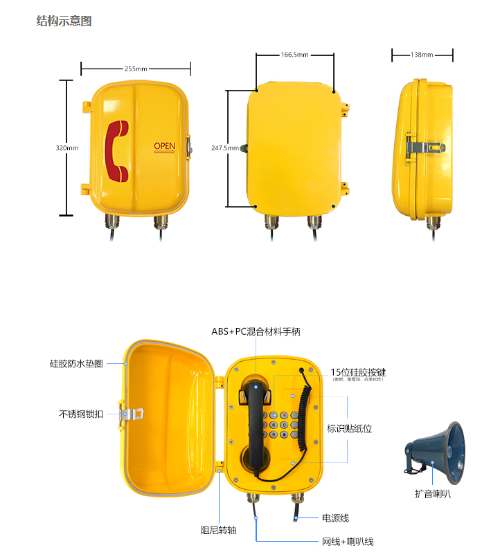6. 话机外壳采用多重防水设计,所有进线位置均使用专业抗老化防水电子胶密封,话机整体防护等级达IP68;
